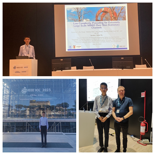 5月28日至6月1日,由国际电气与电子工程师学会(IEEE)通信学会主办的国际电气和电子工程师学会国际通信大会(IEEE ICC)在意大利罗马召开。北京交通大学詹天佑学院2020级本科生许柏恺在电信学院艾渤教授、章嘉懿教授等的指导下完成的论文《非平稳信道下超大规模多天线通信系统的低复杂度预编码方案》(Low-Complexity Precoding for Extremely Large-Scale MIMO Over Non-Stationary Channels)荣获本届大会最佳论文奖(IEEE ICC 2023 Best Paper Award)。