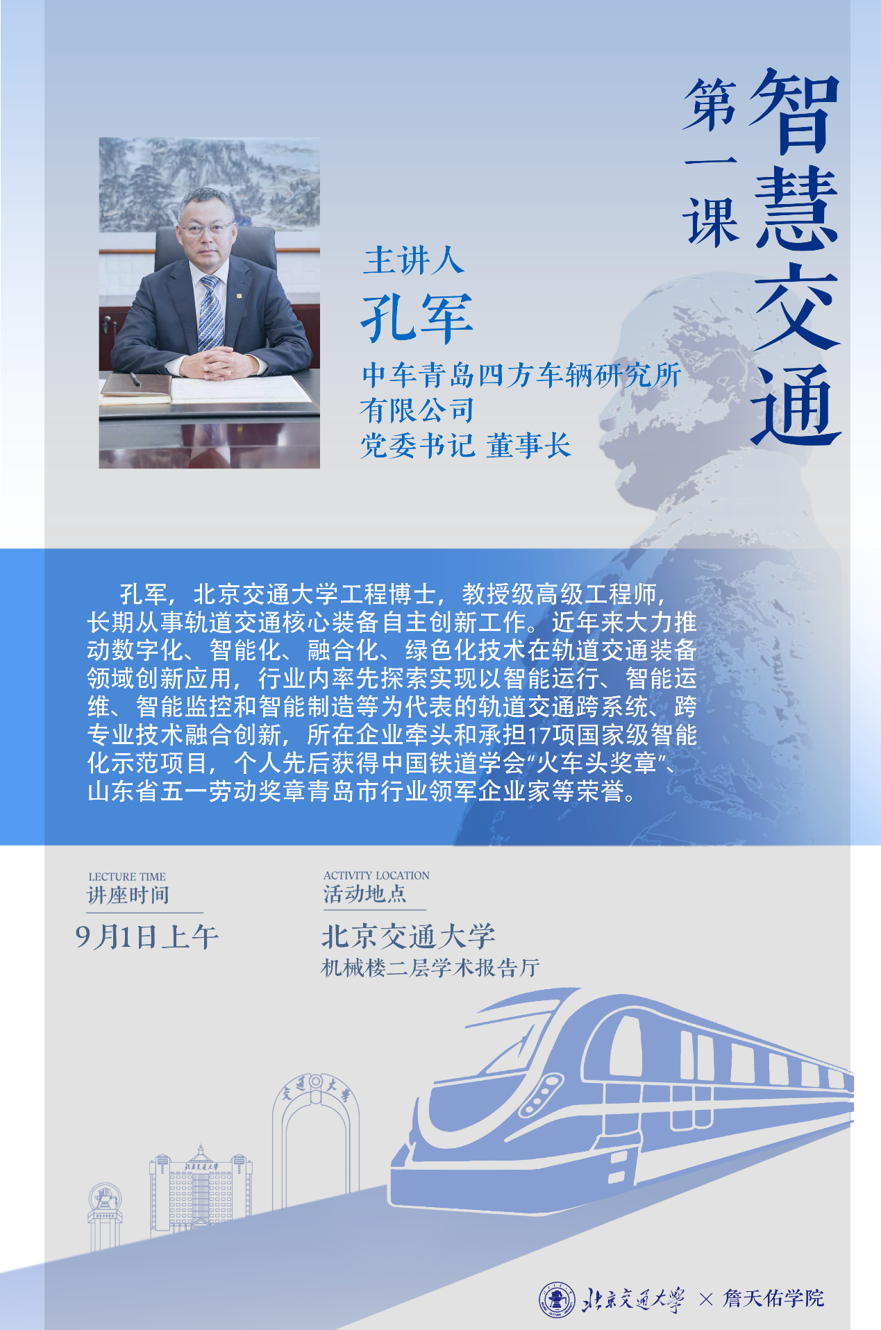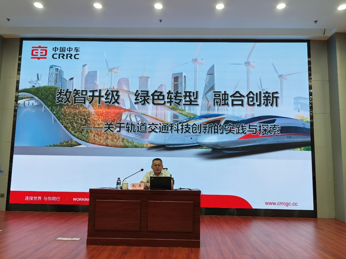 9月1日上午,詹天佑学院邀请了中车青岛四方车辆研究所有限公司党委书记、董事长孔军在机械楼二层学术报告厅开展智慧交通第一课。学院常务副院长、党支部书记史红梅,副书记、副院长王新羿,副院长李清勇和全体2024级本科新生参与分享交流。