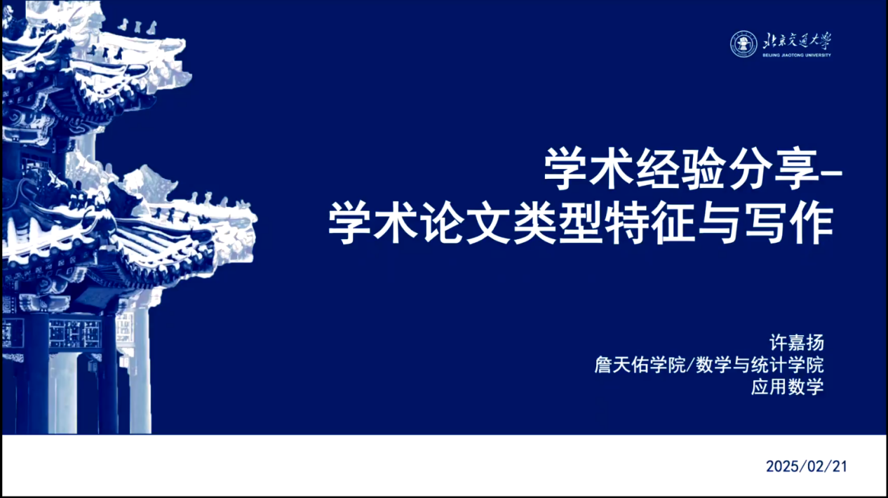 2月21日,应用数学专业博士生许嘉扬结合自身学术论文写作经历,从学术论文对大学生的重要性、选题方法、写作技巧、团队合作、以及如何利用资源和支持等几个方面,以形象生动的语言为同学们提供了实用的建议和技巧。