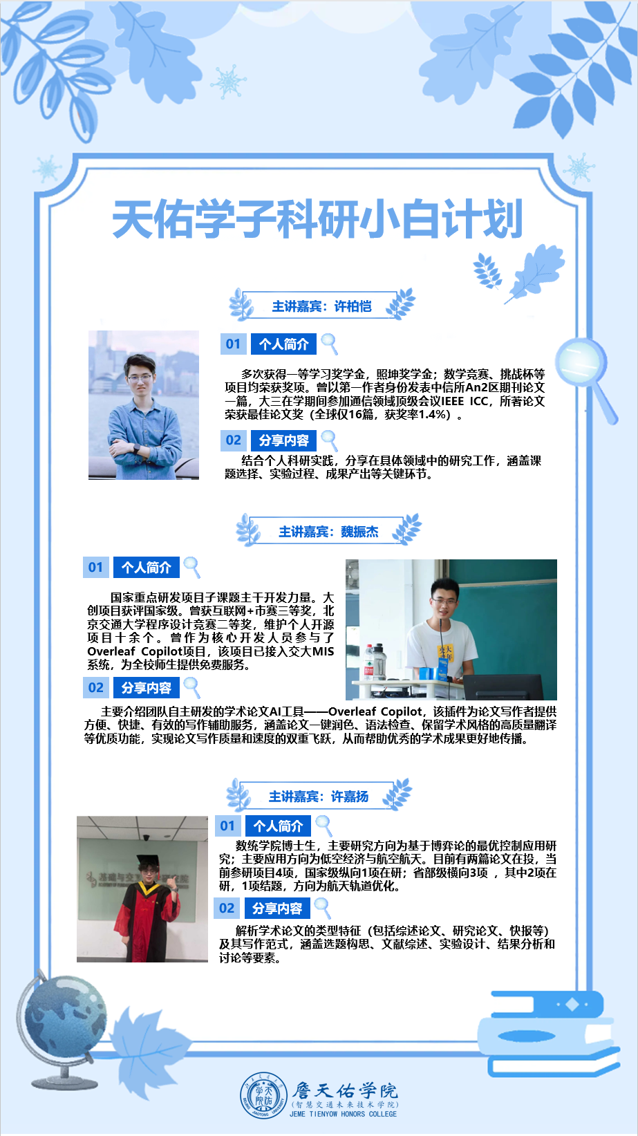 为进一步提升天佑学子的科研素养与创新能力,深化专业认知水平,詹天佑学院推出了“科研小白成长计划”,并于寒假期间开展3期分享活动。