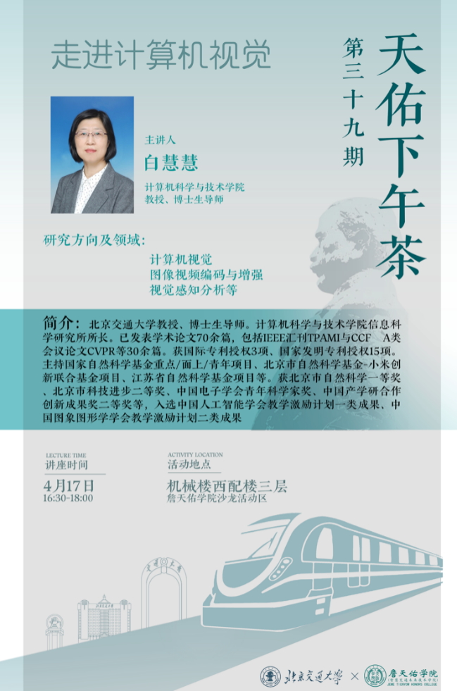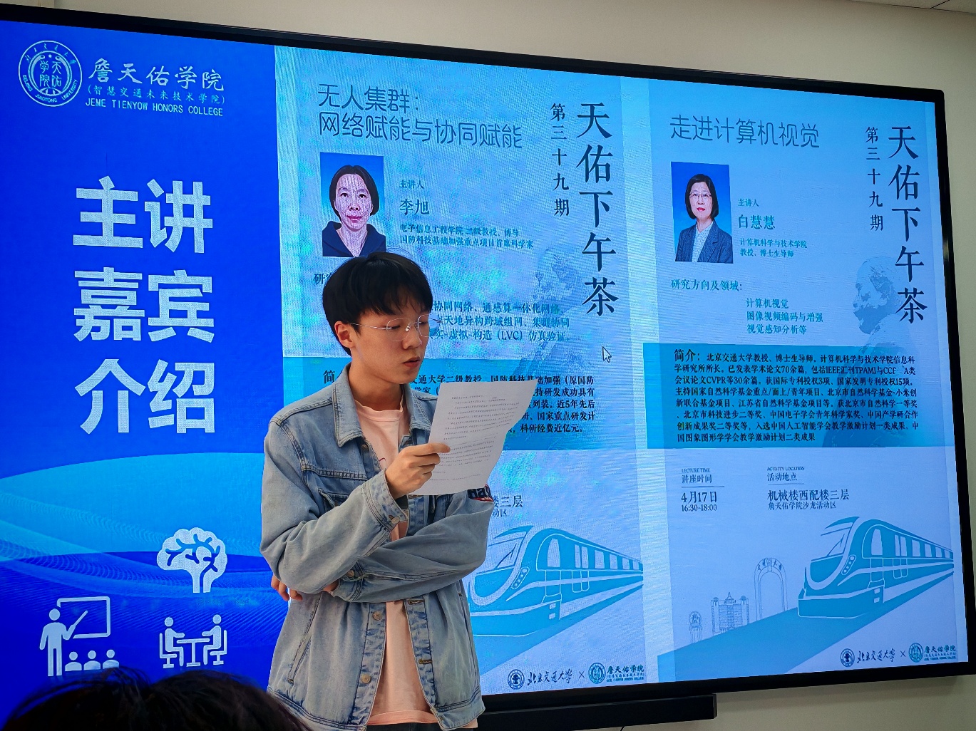 4月17日下午,詹天佑学院与人事处联合举办的第三十九期“天佑下午茶”暨“卓百、青英”面对面活动在机械楼西配楼三层詹天佑学院沙龙活动区顺利举办。本期下午茶由电子信息工程学院李旭教授和计算机科学与技术学院白慧慧教授担任主讲嘉宾,由天佑2101班的黄佳豪同学担任主持人,20余名同学现场参加活动,650人次同步在詹天佑学院视频号观看直播。