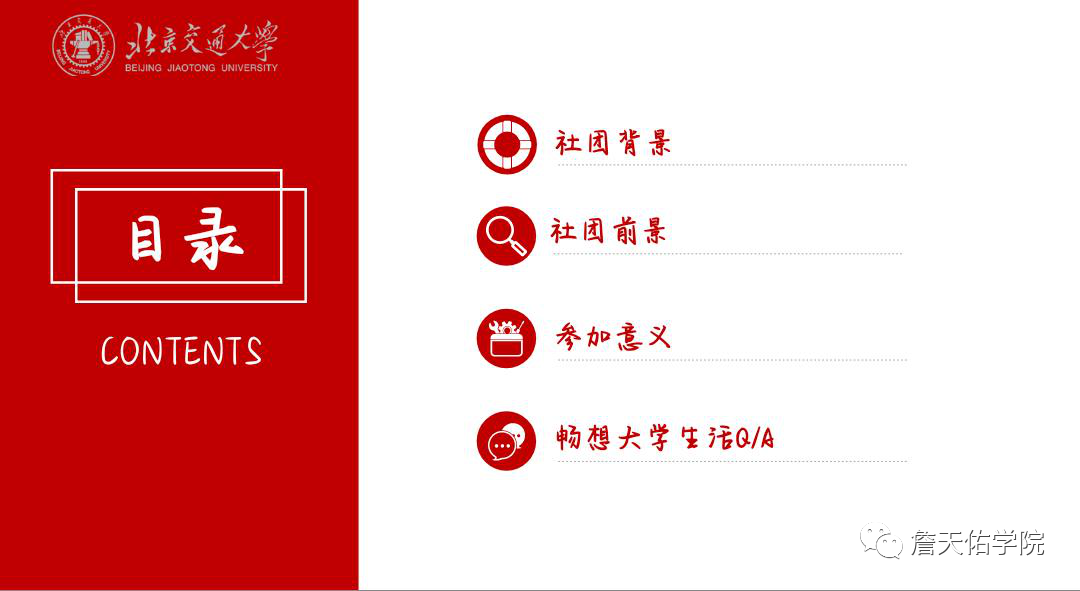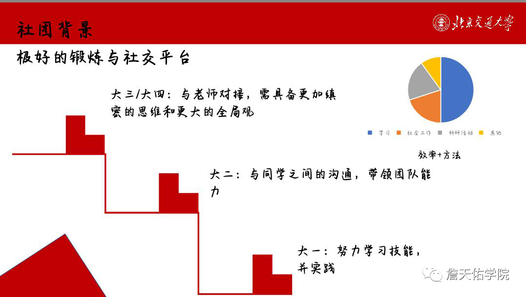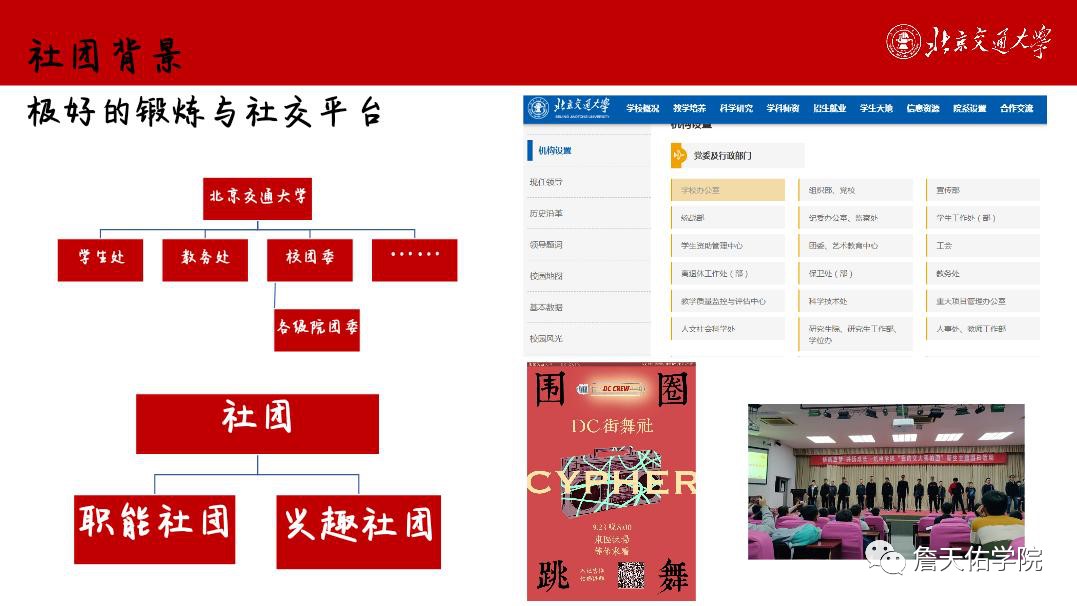 为了让大家更好地认识社团,主持人就大学社团体系进行了一系列的说明:在大学里,社团是极好的锻炼和社交平台,参加社团也可以培养新技能,让自己实现全面发展。大家了解社团的运行方式后,心中对社团有了更加明确的认知。